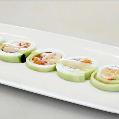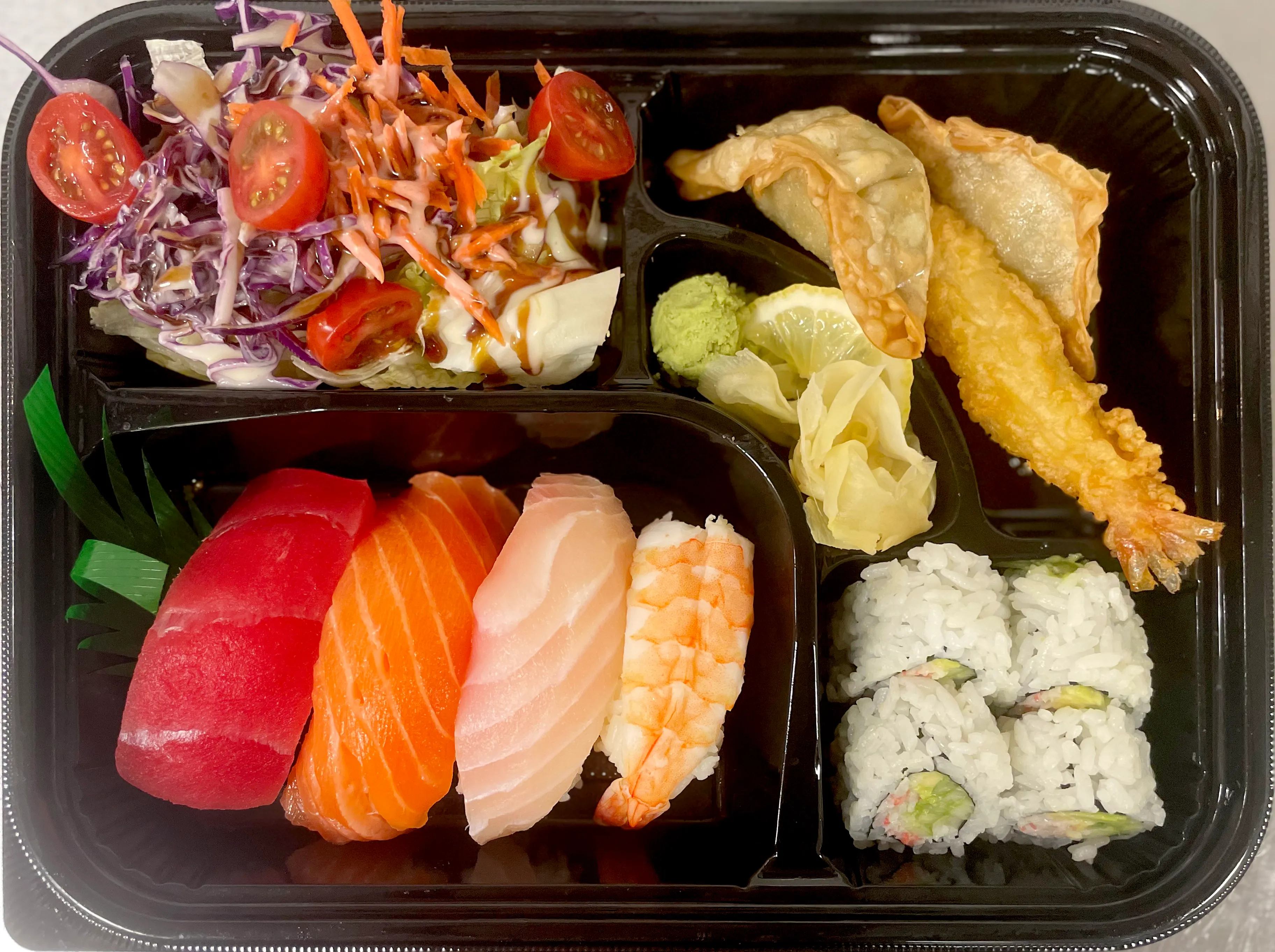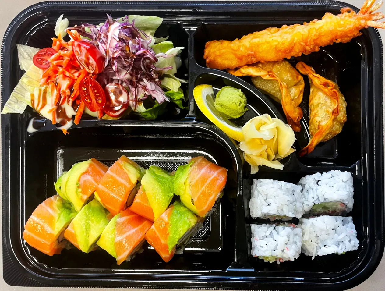 A Selected Special Roll served with 4 pcs California Roll, 2 pcs Fried Pork Gyoza, 1 pc Shrimp Tempura, and fresh salad. (No substitutions)