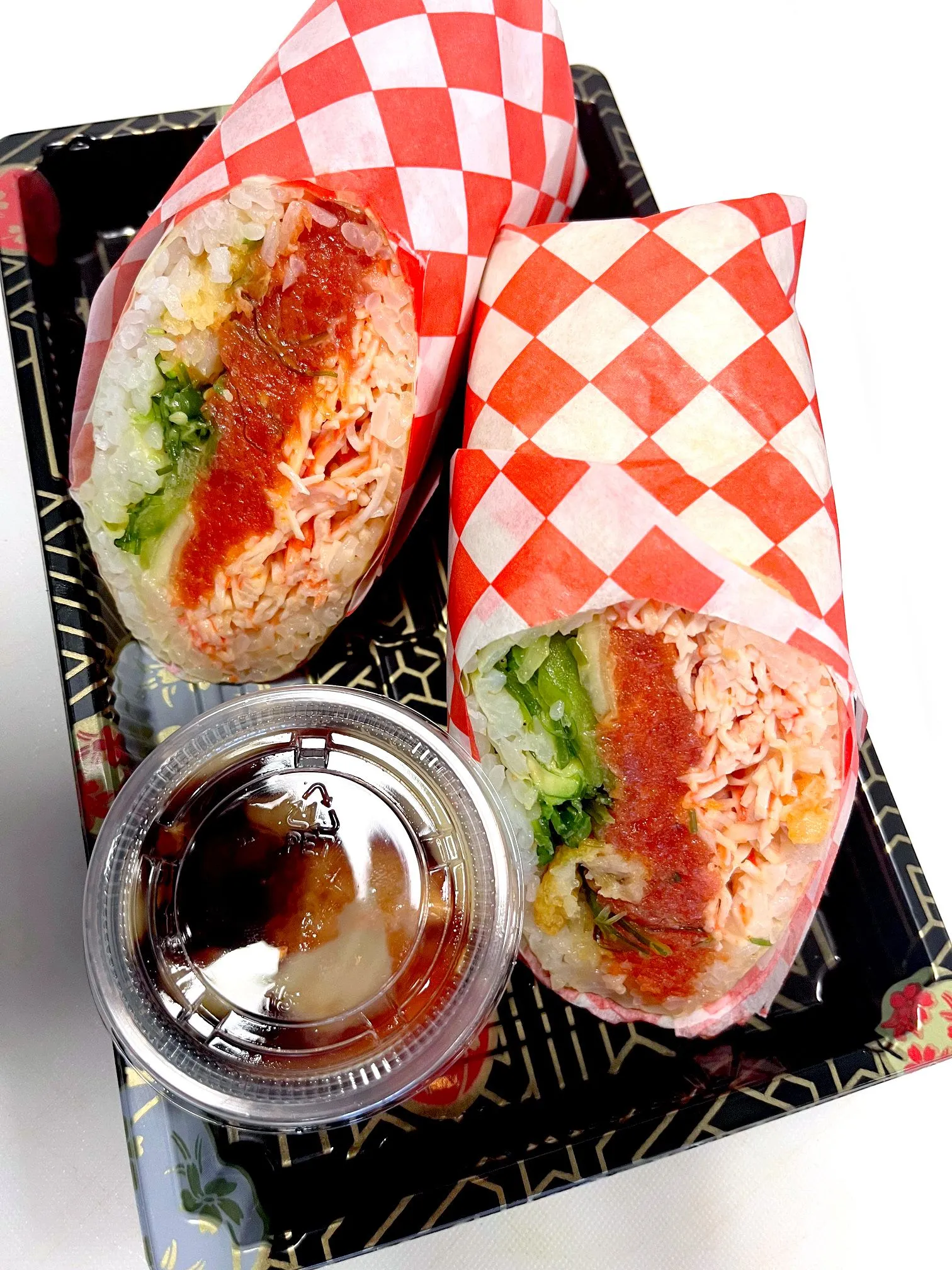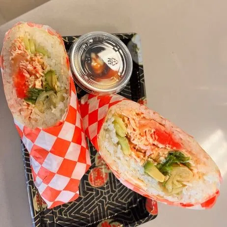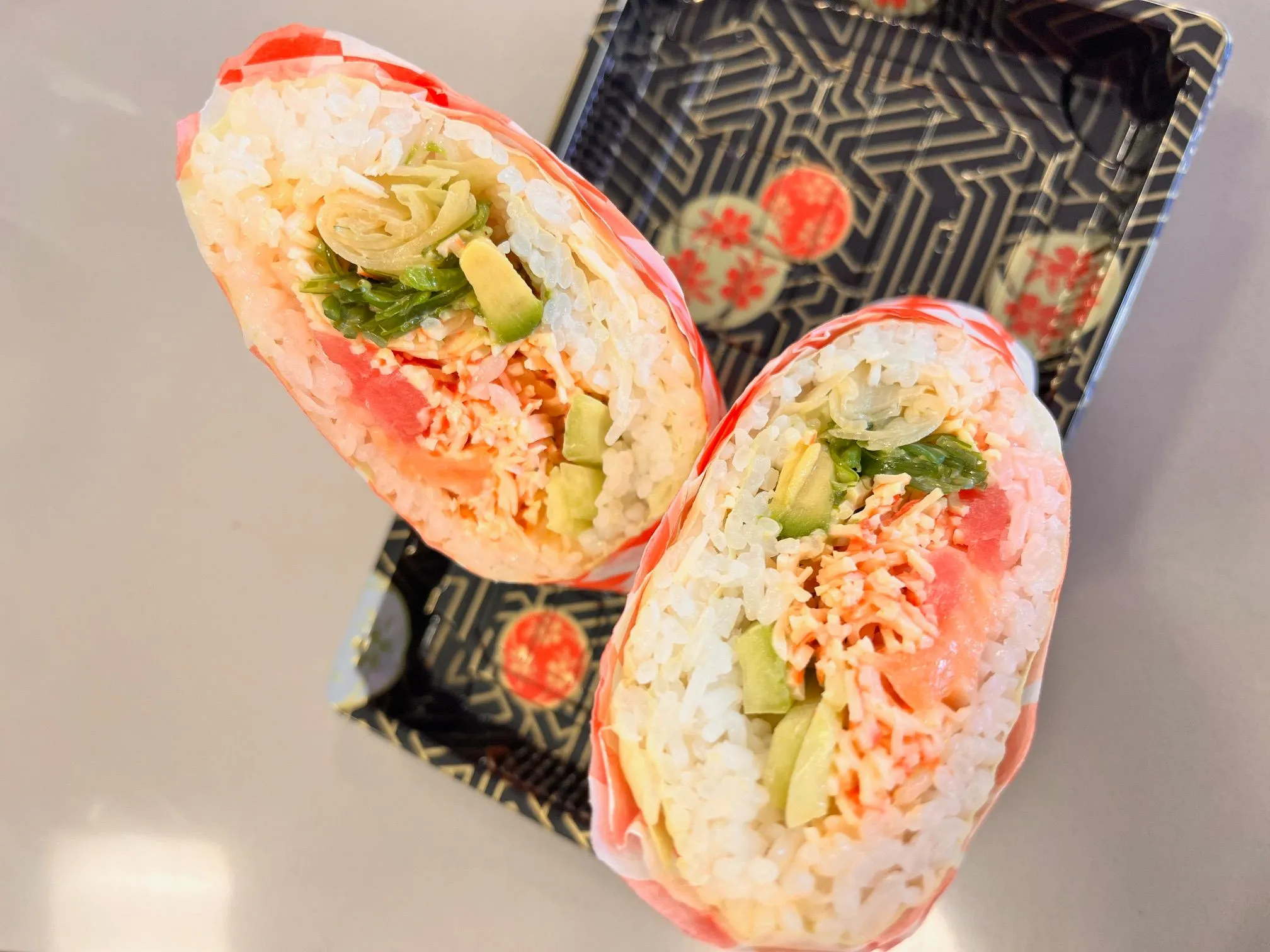 Sushi Burrito Filled With Salmon, Tuna, Spicy Crab Mix, And Seaweed Salad Complemented By Fresh Avocado, Ginger, And Cucumber. Wrapped In A Sushi Rice And Seaweed Exterior.