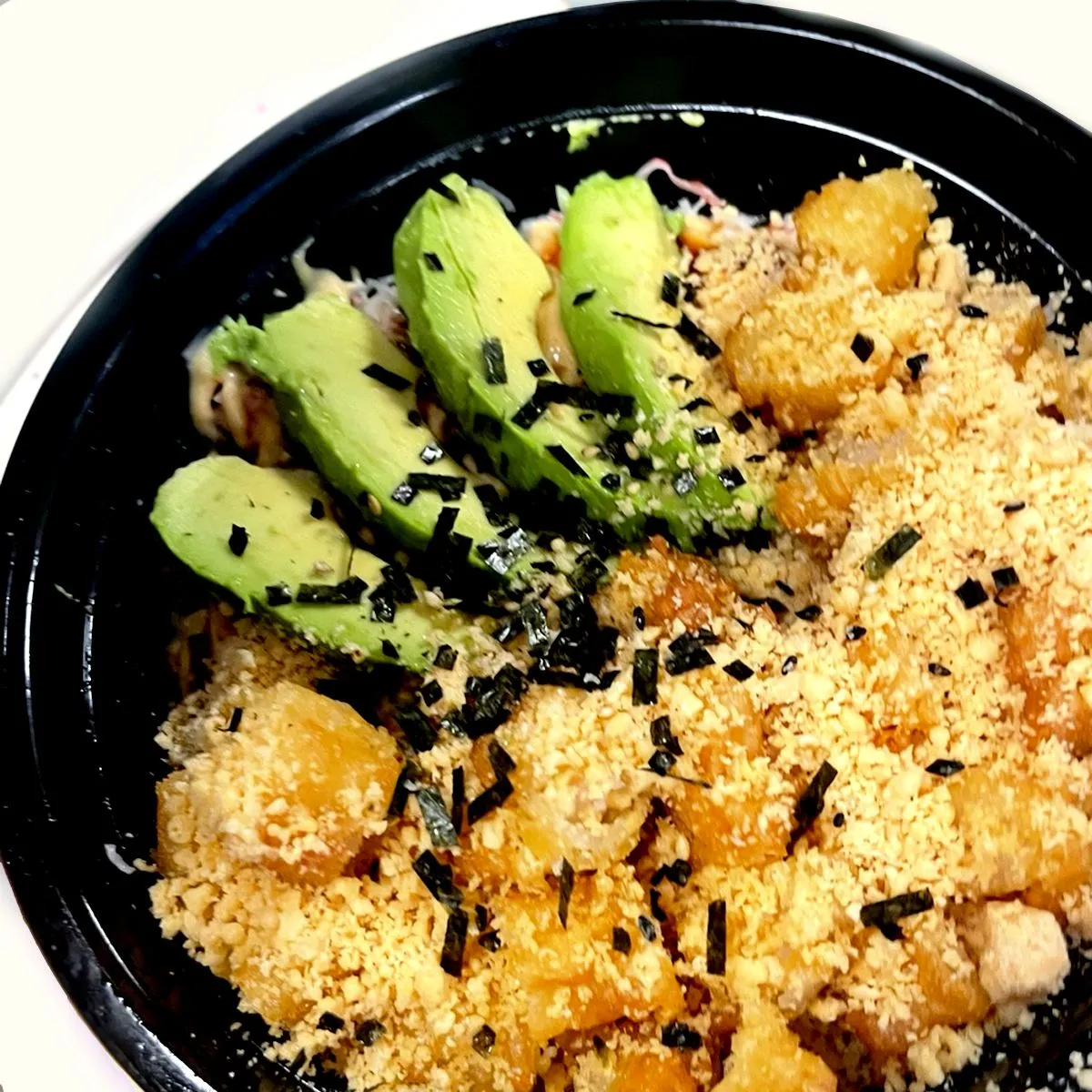 Crab, Spicy Tuna, Avocado, Masago Bedded On Sushi Rice.
