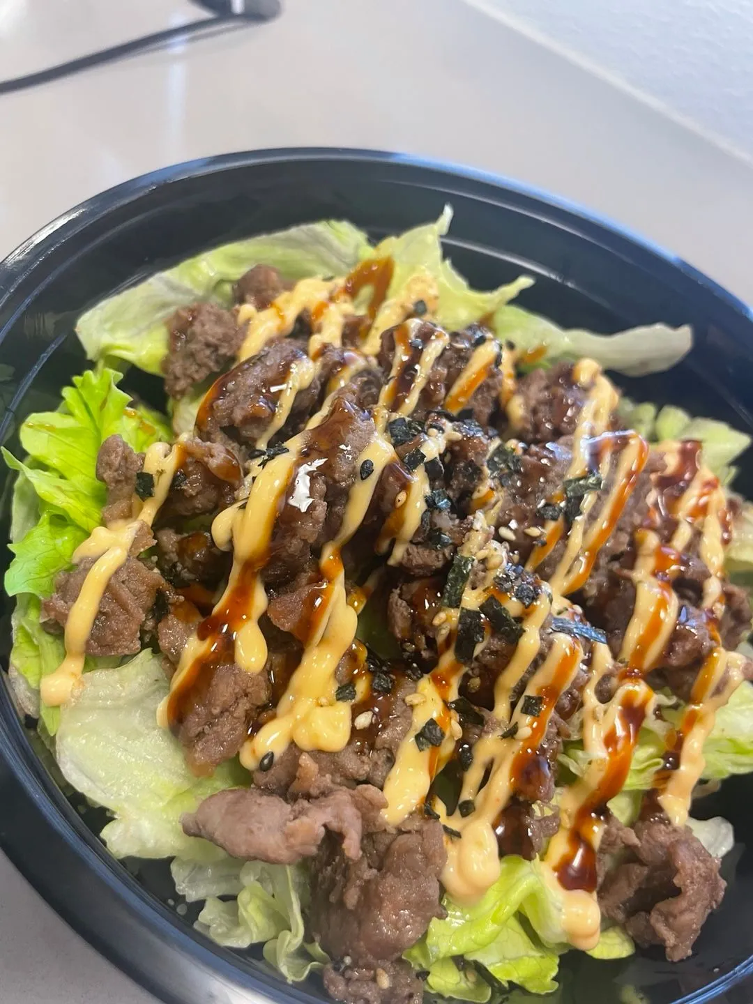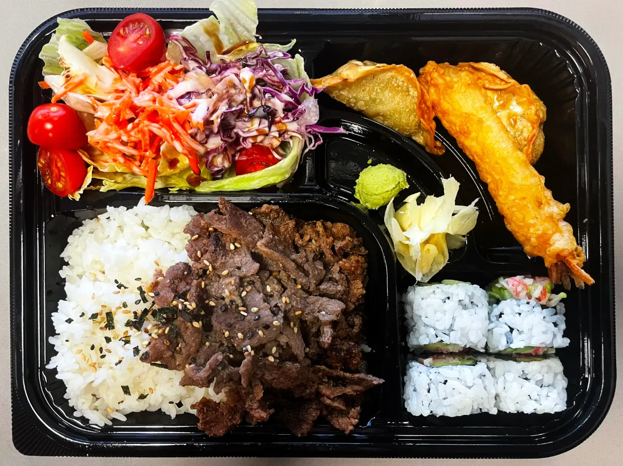 Bulgogi(Korean Marinated Beef) and Sushi Rice served with 4 pcs California Roll, 2 pcs Fried Pork Gyoza, 1 pc Shrimp Tempura, and fresh salad. (No substitutions)