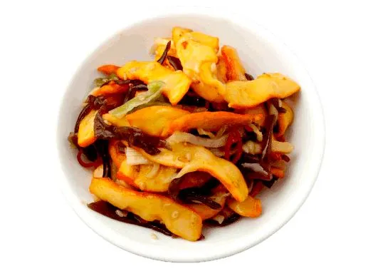 Thinly Sliced Squid Mixed With Seaweed, Bell Peppers, And Onions, Garnished With Red Chili Slices.