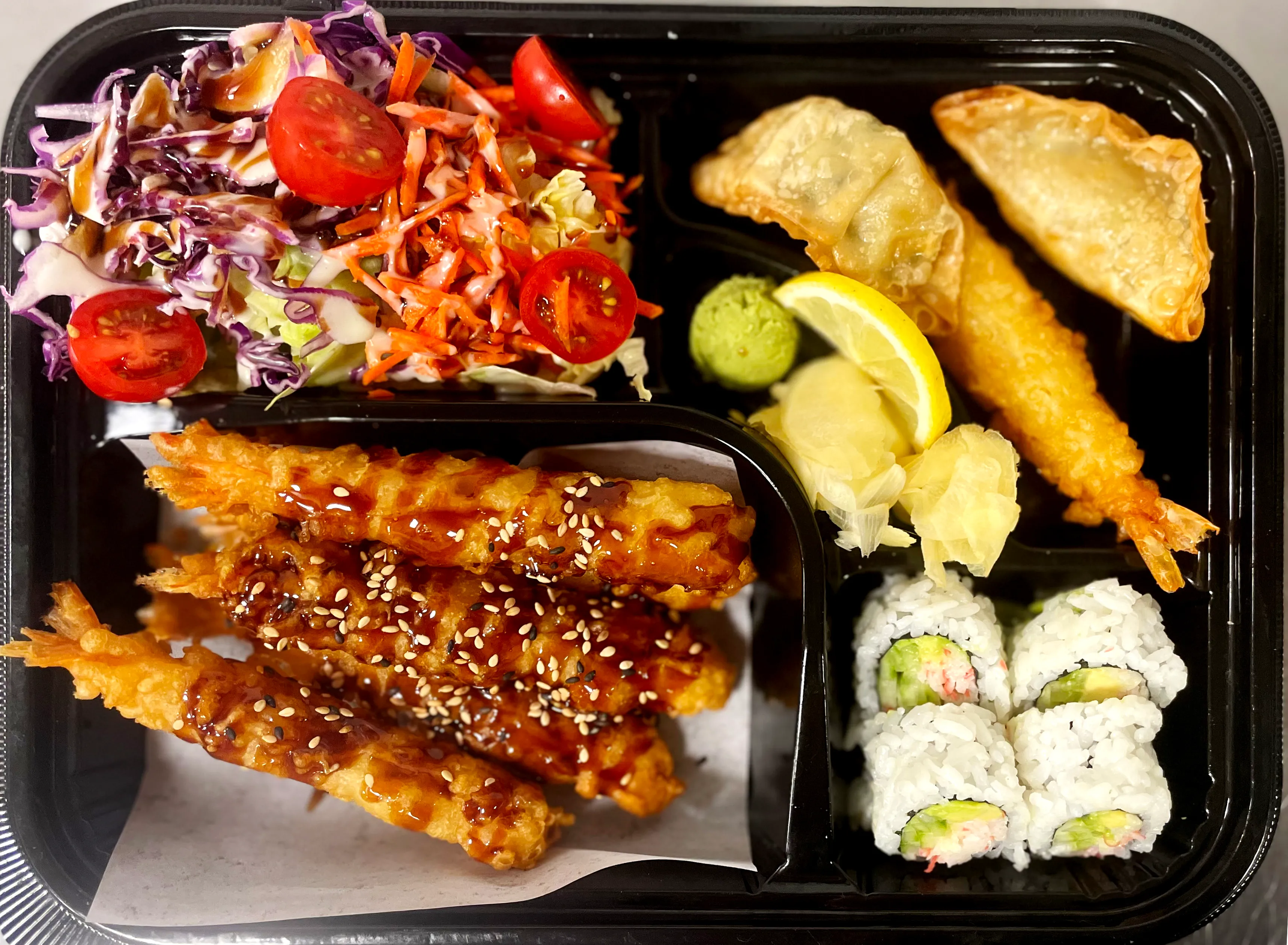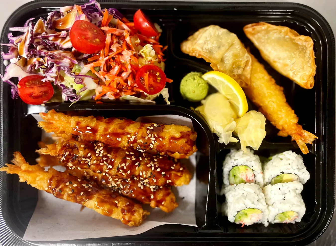 5 pcs Tempura Shrimp topped with eel sauce, served with 4 pcs California Roll, 2 pcs Fried Pork Gyoza, 1 pc Shrimp Tempura, and fresh salad. (No substitutions)